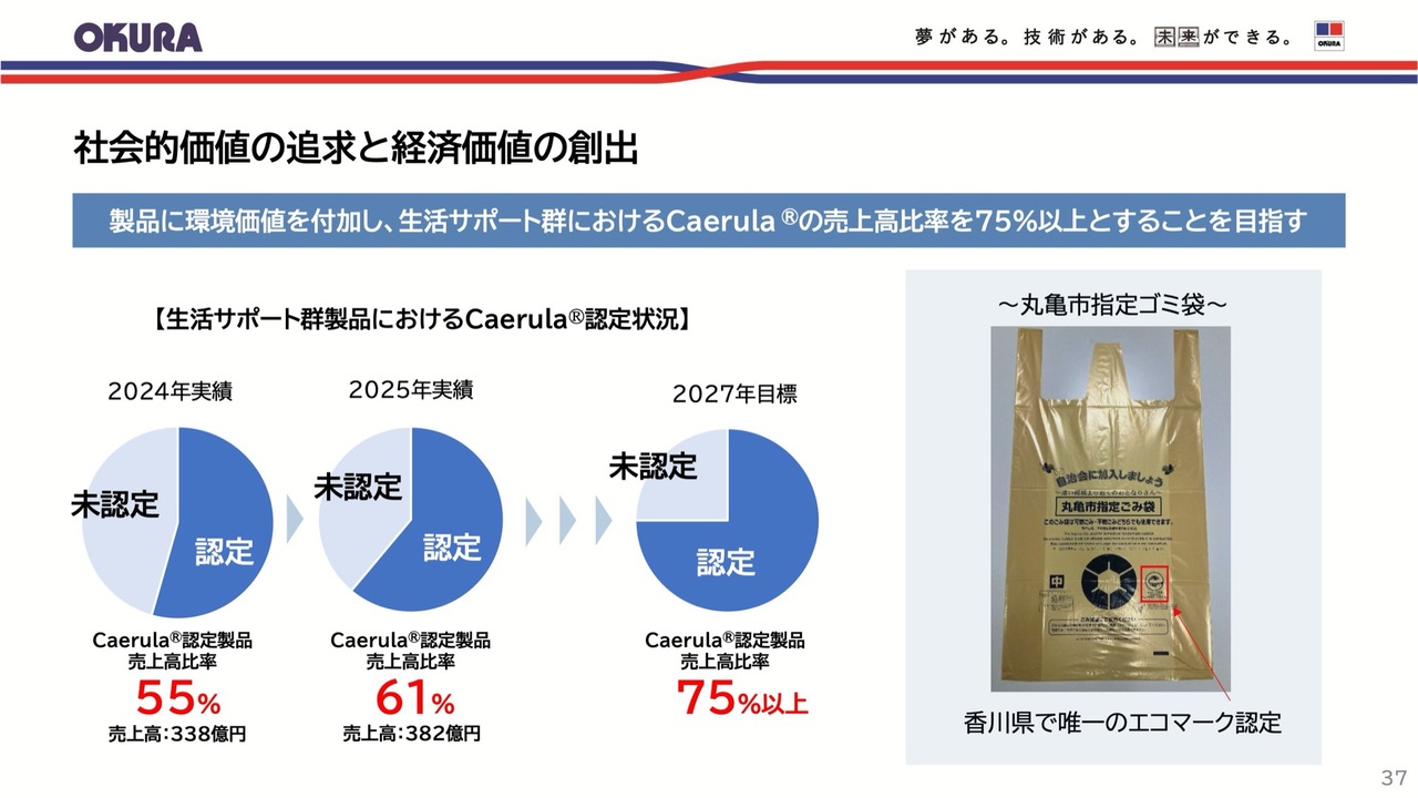 生活サポート部における「Caerula」の売上高比率は、2027年に75パーセント以上を目指しており、2025年の実績は61パーセントとなりました。今後も「Caerula」の普及活動を通じて、持続可能な社会の実現と企業価値向上を目指します。
