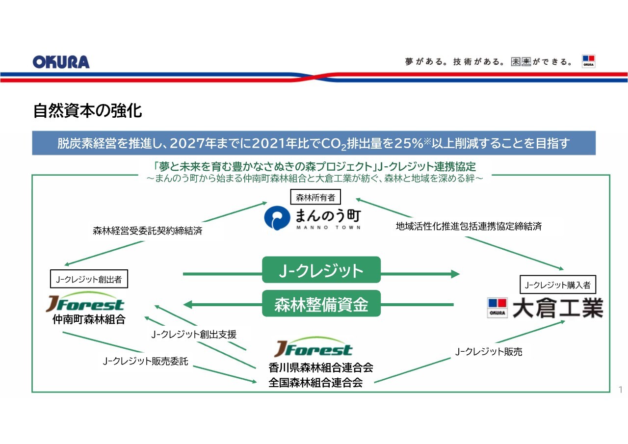 その取り組みの1つとして、2025年12月に「夢と未来を育む豊かなさぬきの森プロジェクト」を立ち上げました。本プロジェクトでは、まんのう町の森林を管理する仲南町森林組合が、香川県森林組合連合会および全国森林組合連合会の支援を受け、森林由来のJ-クレジットを創出します。
