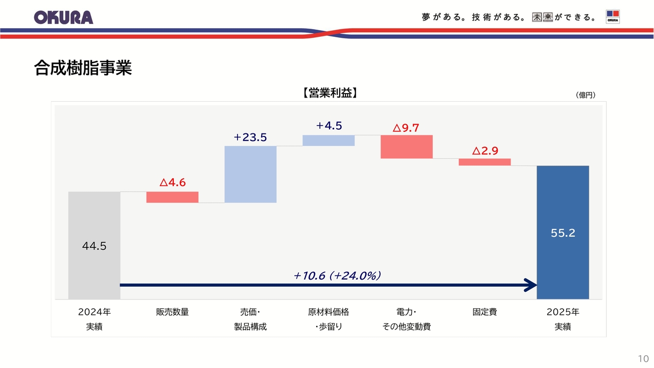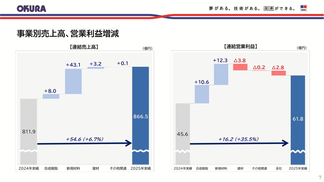 新規材料事業における生産量拡大に伴う原材料費の増加や全社的な人件費などのコスト増がありました。しかし、同事業における高単価製品の構成比率の上昇と、販売数量の増加が奏功し、増益を達成しました。