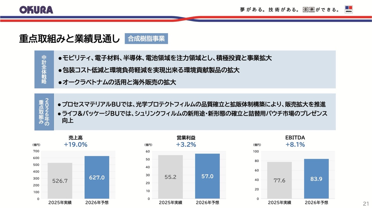 合成樹脂事業では、売上高を前年比19パーセント増の627億円、営業利益を前年比3.2パーセント増の57億円と見込んでいます。
