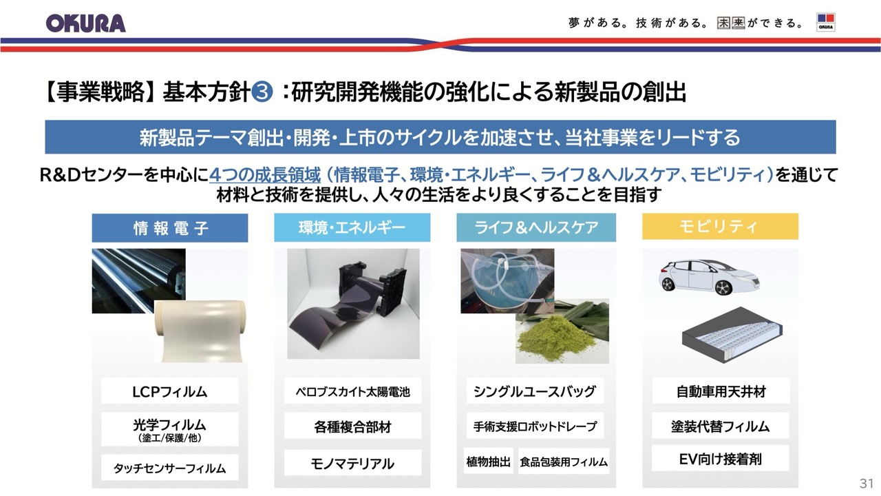 最後に、基本方針の3つ目である「研究開発機能の強化による新製品の創出」についてご説明します。研究開発の基本方針として、「技術マーケティングと市場マーケティングを強化し、イノベーションを通じて新たな需要と市場を創造する」ことを掲げています。