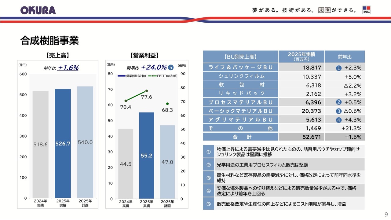 ライフ&パッケージBUでは、詰替用パウチやカップ麺向けシュリンク製品が堅調に推移し、前年比2.3パーセントの増収を達成しました。
