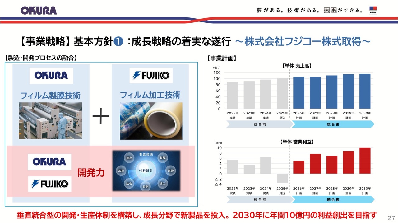このシナジー効果を最大限に発揮するため、まず製造・開発プロセスを融合します。具体的には、当社のフィルム製膜技術と同社のフィルム加工技術、さらに両社の開発力を結集させることで、垂直統合型の開発・生産体制を確立します。