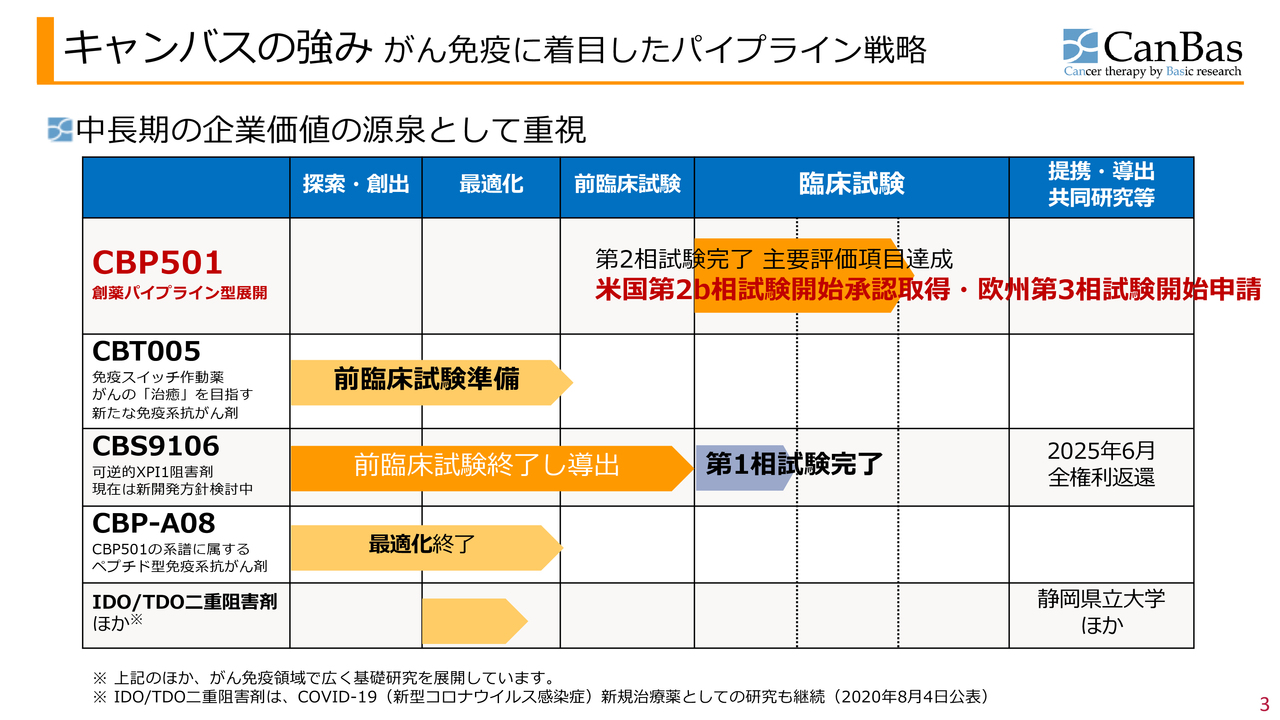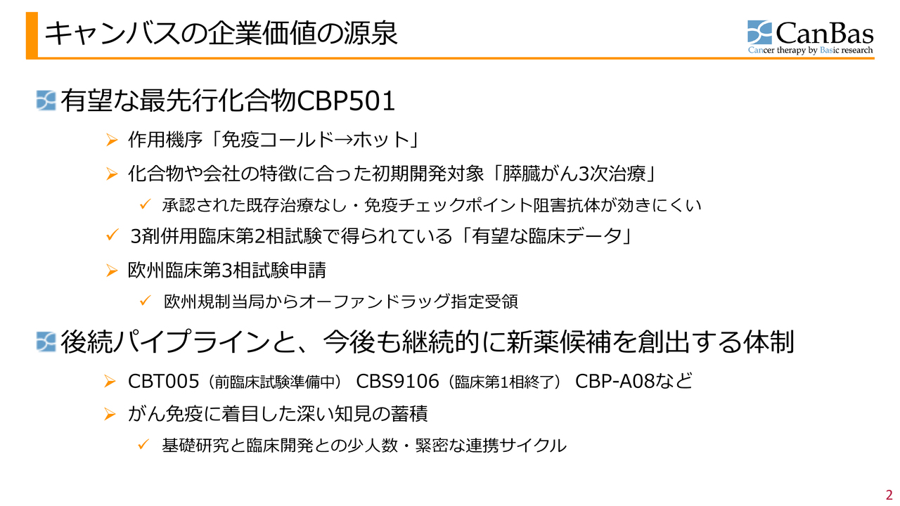キャンバスの企業価値の源泉のご説明です。1つ目は有望な最先⾏化合物「CBP501」です。臨床第2相試験まで有望な臨床データを伴って終了しており、現在は臨床第3相試験の申請を進めています。また、こちらは自前の創薬パイプライン型の開発で進めています。
