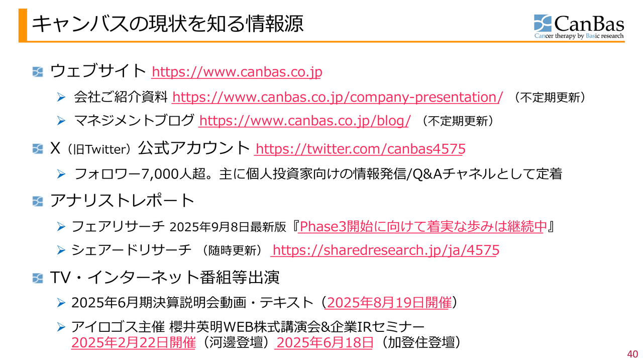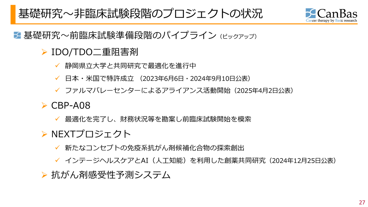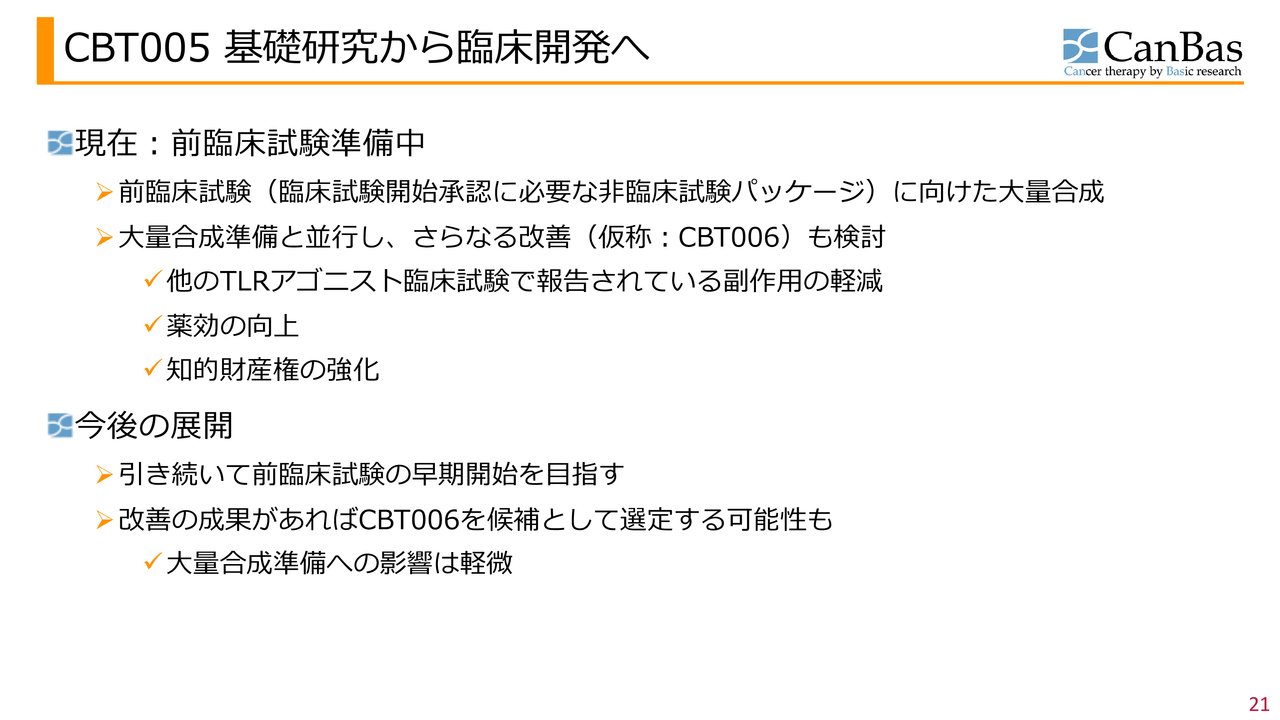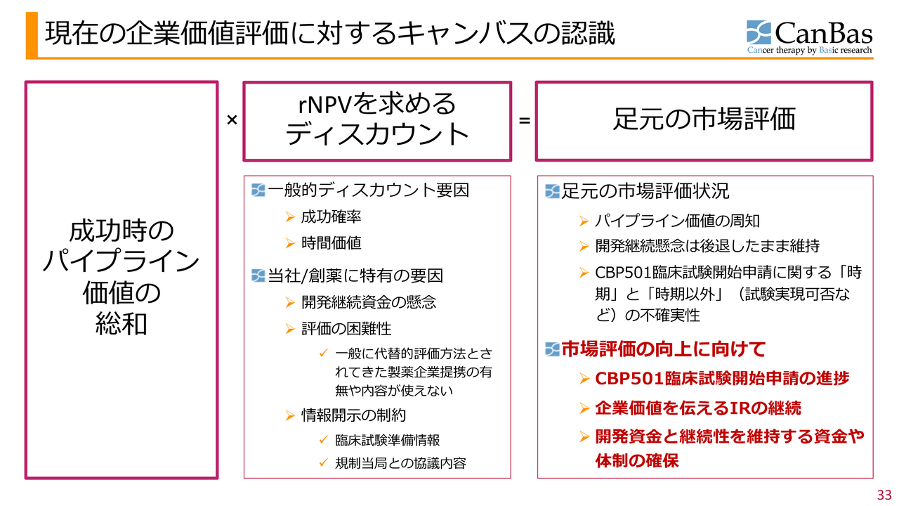 また冒頭にも申し上げたとおり、当社は「CBP501」のみに取り組んでいるわけではありません。今後も後続のパイプラインや、継続的に新薬候補を創出していき、きちんと企業価値の評価に反映させていくことが当面の課題と考えています。