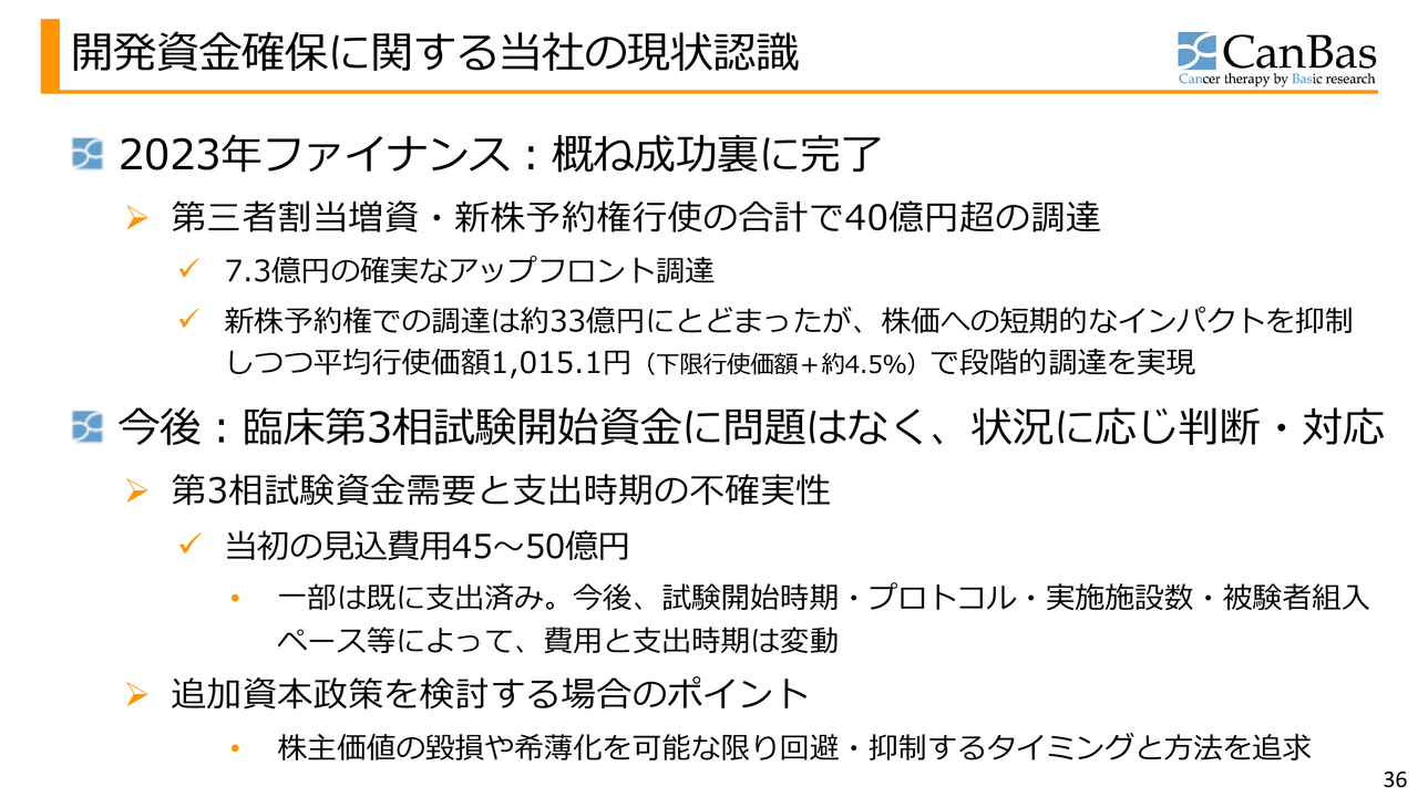 臨床第3相試験開始後の資金需要については、当初の見込費用から大きな変動はありません。追加の資本政策を検討する際には、株主価値の毀損や希薄化を可能な限り回避、または抑制する方法やタイミングを追求していきたいと考えています。