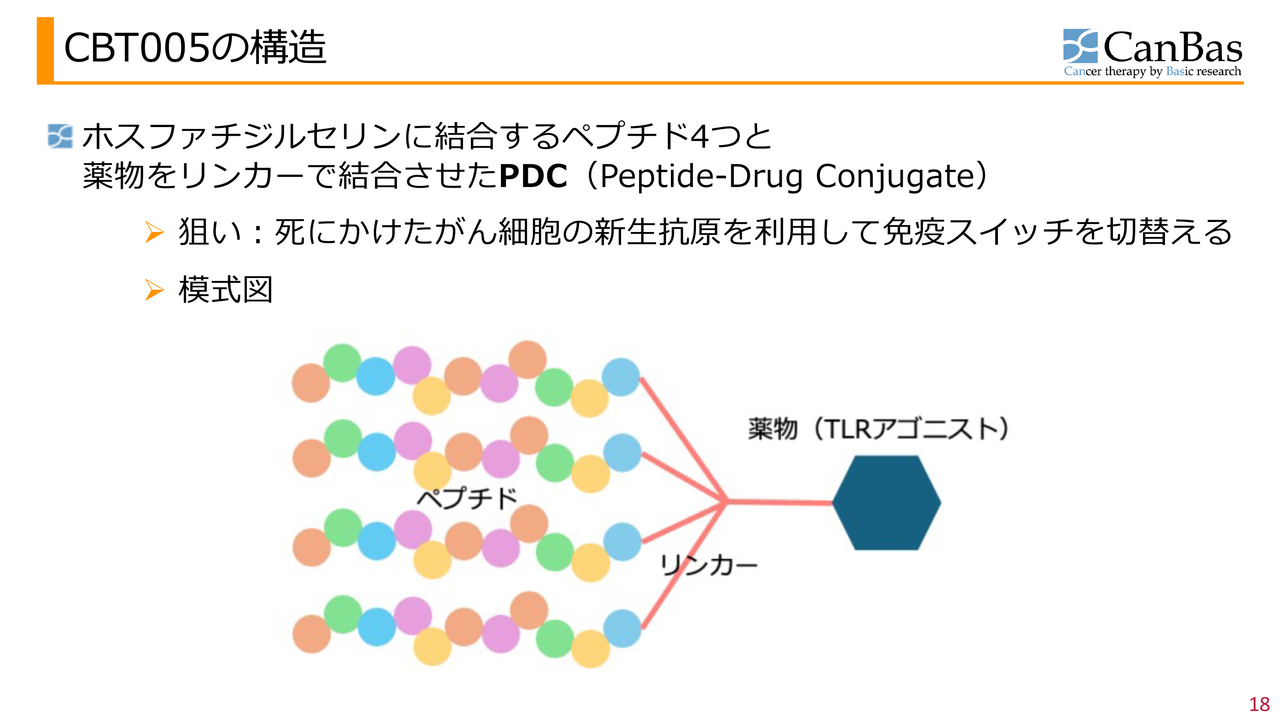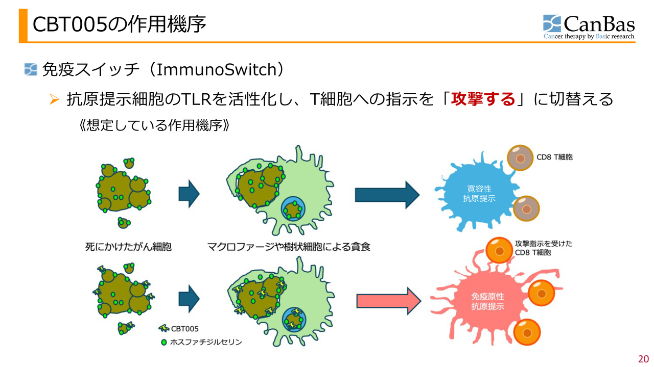 免疫スイッチ作動薬「CBT005」についてご説明します。3ページで示したパイプラインの2つ目に該当するもので、当社では非常に有望であると考えています。