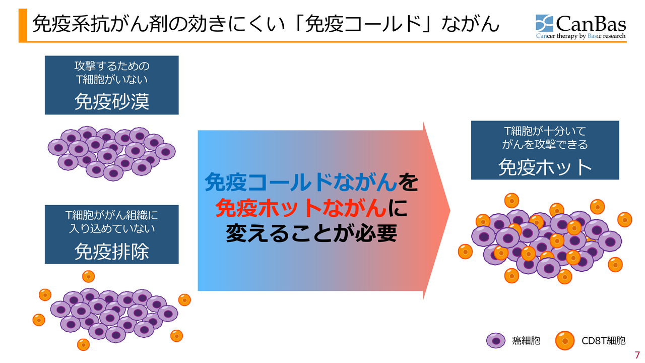 がんの中には「免疫砂漠」や「免疫排除」と呼ばれるタイプがあり、これらはCD8T細胞が存在しない、または存在していてもがん細胞内部に入り込まない場合があります。その代表的ながんとして膵臓がんがあります。