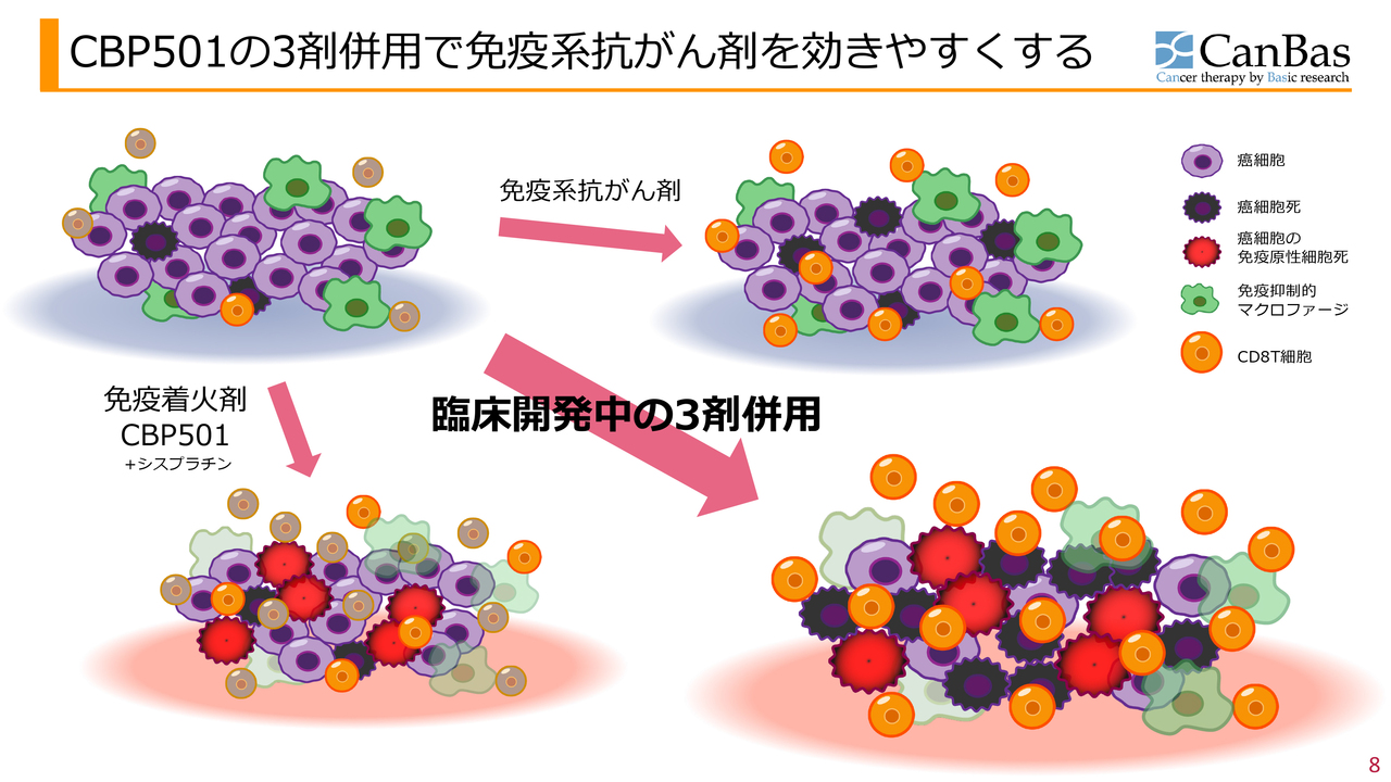 一方、免疫着火剤である「CBP501」と「シスプラチン」を加えたものが、スライド左下のイラストです。がん細胞が死ぬ際には、アポトーシスという、免疫を活性化しない死に方をしますが、「CBP501」は免疫を活性化する炎症が起きるような死に方に導きます。この様子を赤色とトゲトゲで表現していますが、がん細胞が派手に死ぬことで、CD8T細胞が腫瘍内部に侵入する助けとなります。