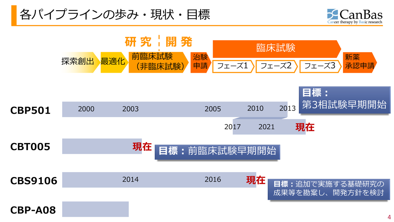 河邊拓己氏(以下、河邊):代表取締役社長の河邊です。現在、キャンバスが保有するパイプラインはスライドのとおりです。最重要パイプラインである「CBP501」と、その次に「CBT005」が続きます。さらに「CBS9106」「CBP-A08」、その他が控えています。