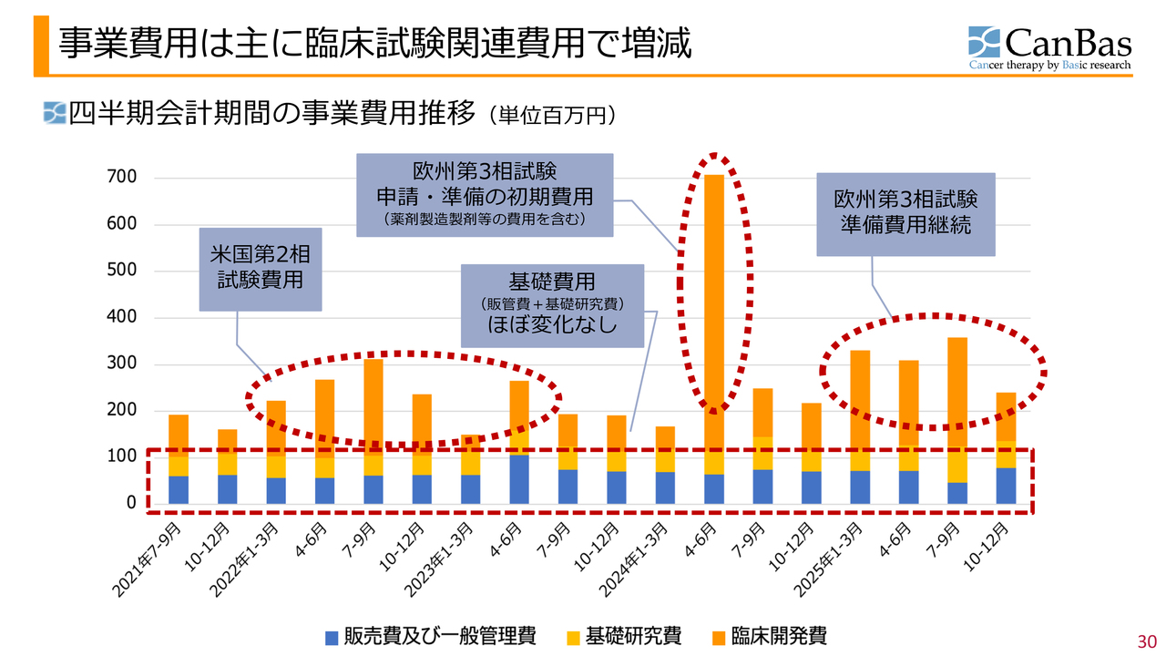 一部の投資家のみなさまや決算書をご覧の方々から、「この状況が続くのならば、今のキャッシュで大丈夫なのか」といったご心配をいただいていました。この製造関連の規制対応費用等のピークは、ひとまず越えた状況です。2025年10月から12月の第2四半期会計期間については、臨床開発費は約1億円強となり、いったん落ち着いています。