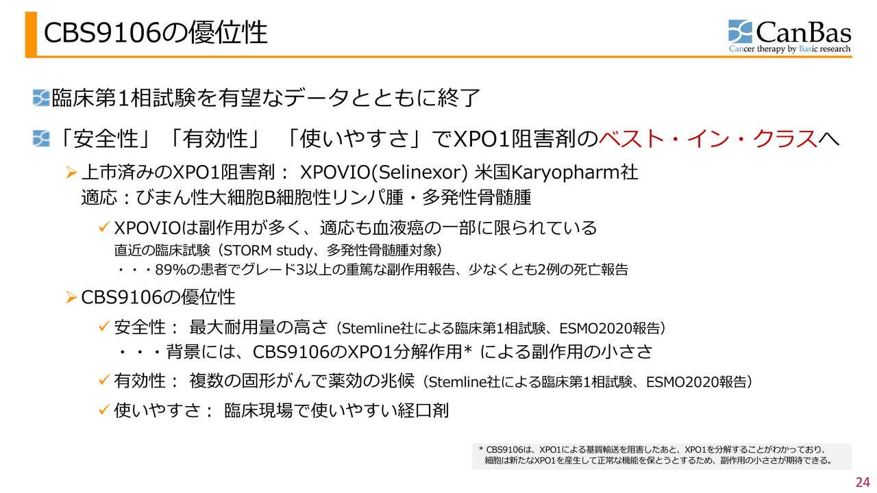 すでに上市済みのXPO1阻害剤「XPOVIO(Selinexor)」をKaryopharm社が販売していますが、それに対して「CBS9106」はより副作用を少なくできると考えており、「ベスト・イン・クラス」を目指しています。