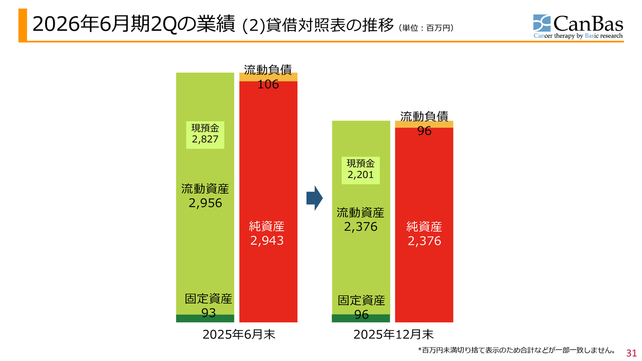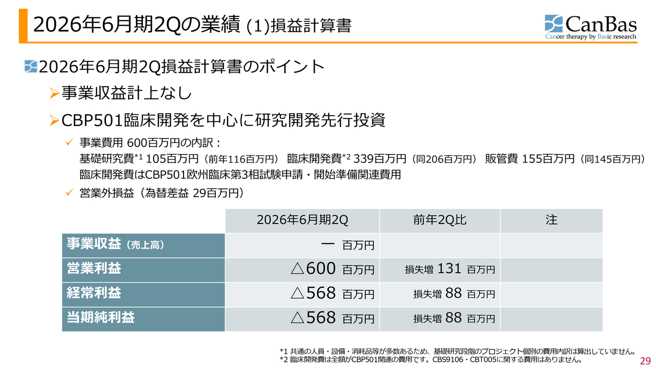 加登住:2026年6月期第2四半期決算および財務状況についてご報告します。まず損益計算書です。これまでと同様に、事業収益の計上はありません。「CBP501」の臨床開発を中心に、研究開発投資を先行させている状況です。