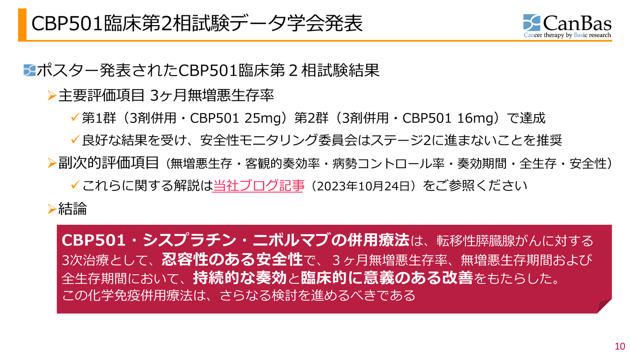 「CBP501」の臨床第2相試験の結果について簡単にご説明します。スライドはポスター発表された内容です。「CBP501」を投与した第1群(3剤併⽤・CBP501 25mg)と第2群(3剤併⽤・CBP501 16mg)とも良好な結果となりました。