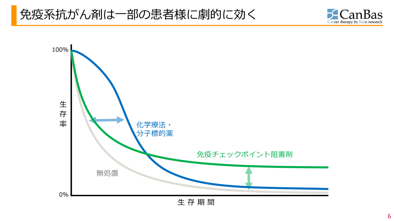 一方で免疫チェックポイント阻害剤は、効く患者さまは少ないものの、効果があった患者さまには非常に長期にわたり効果が続く特徴があります。現在はこの免疫チェックポイント阻害型の抗がん剤の開発が主流となっています。
