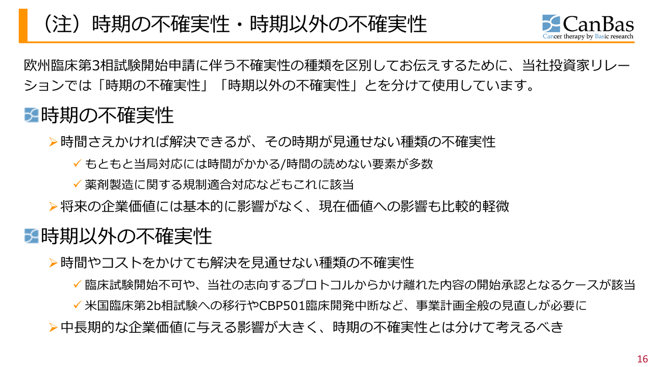 まず「時期に関する不確実性」については、当社でコントロール不能な要素が現在も存在しています。これについては当局とのやり取りが背景にあり、当社として予測が難しい部分があるため、いつどのようになるのかを確実にお伝えできる状況にはありません。