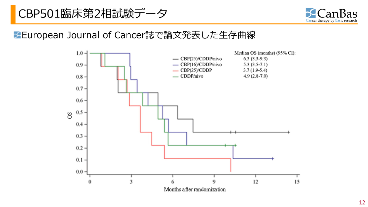 スライドはカプランマイヤー生存曲線です。凡例の一番上が「CBP501」の推奨投与量の群です。