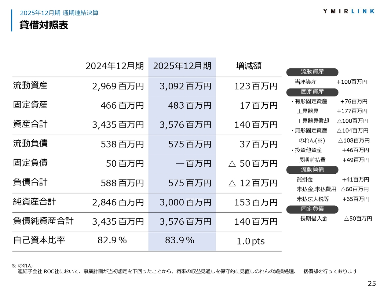 貸借対照表です。2025年12月期の資産合計は、当座資産が約1億円増加したことなどにより、前期末から1億4,000万円増加の35億7,600万円となりました。