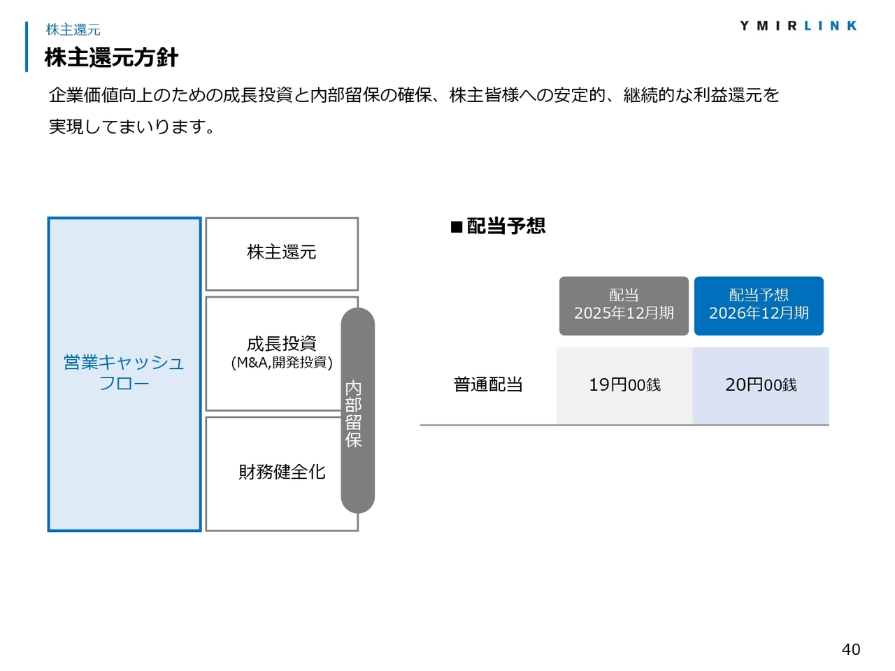 株主還元方針です。当社では成長投資と内部留保の確保、株主のみなさまへの継続的な利益還元が実現可能と判断しています。2026年12月期は1株当たり1円増配となる、20円の配当を見込んでいます。