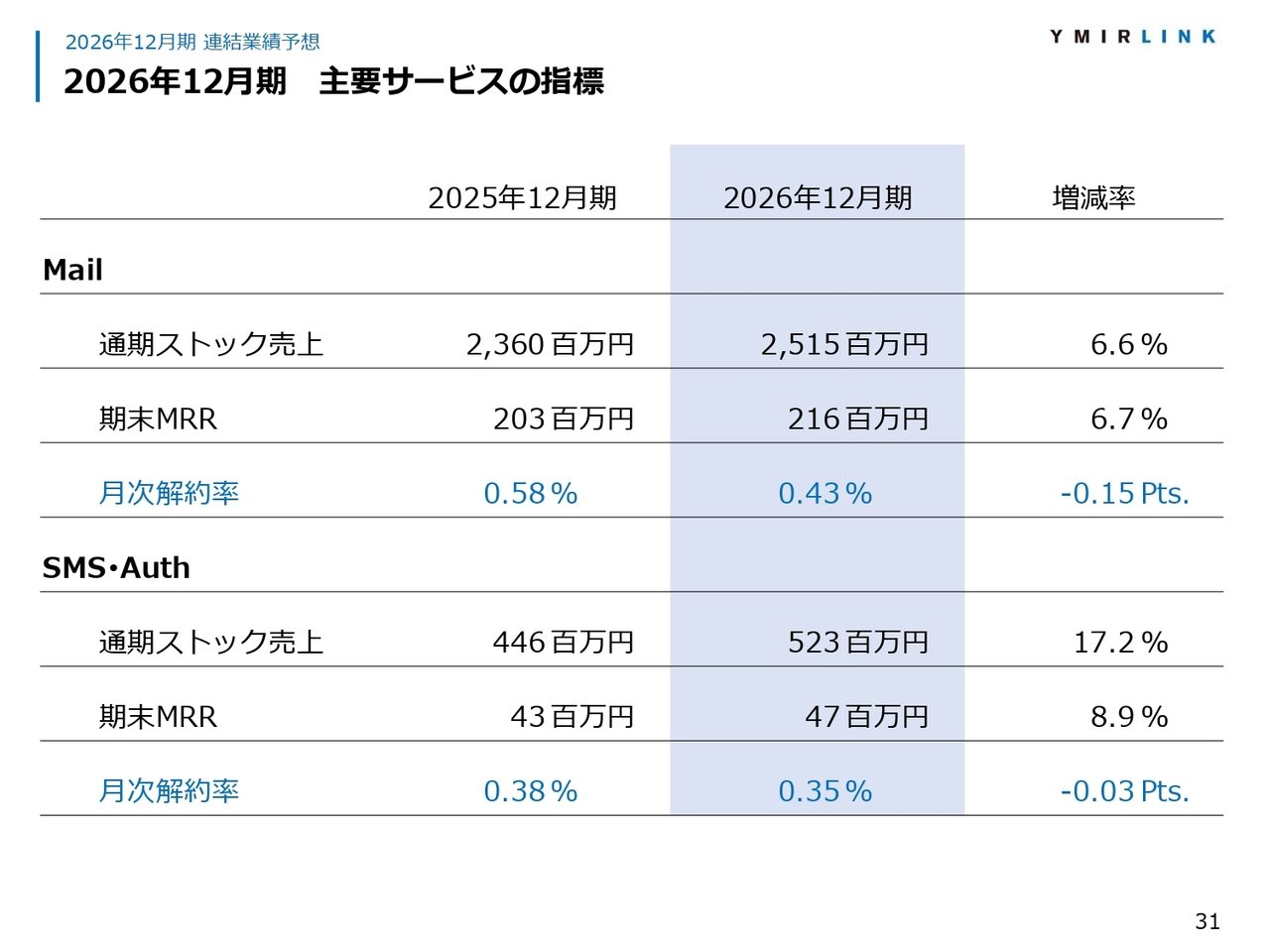 主要サービス別の見通しです。Mailサービスの通期ストック売上は、前年同期比で6.6パーセント増収となる25億1,500万円を見込んでいます。SMSサービスの通期ストック売上は、前年同期比で17.2パーセント増収となる5億2,300万円を見込んでいます。