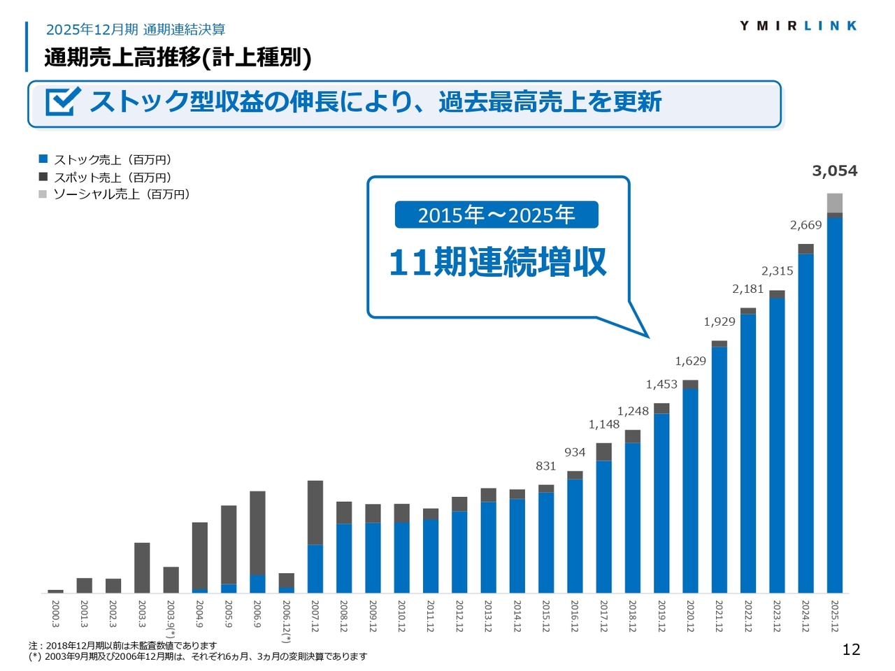 通期売上高推移です。ストック型収益の積み上がりにより、11期連続の増収を達成しました。