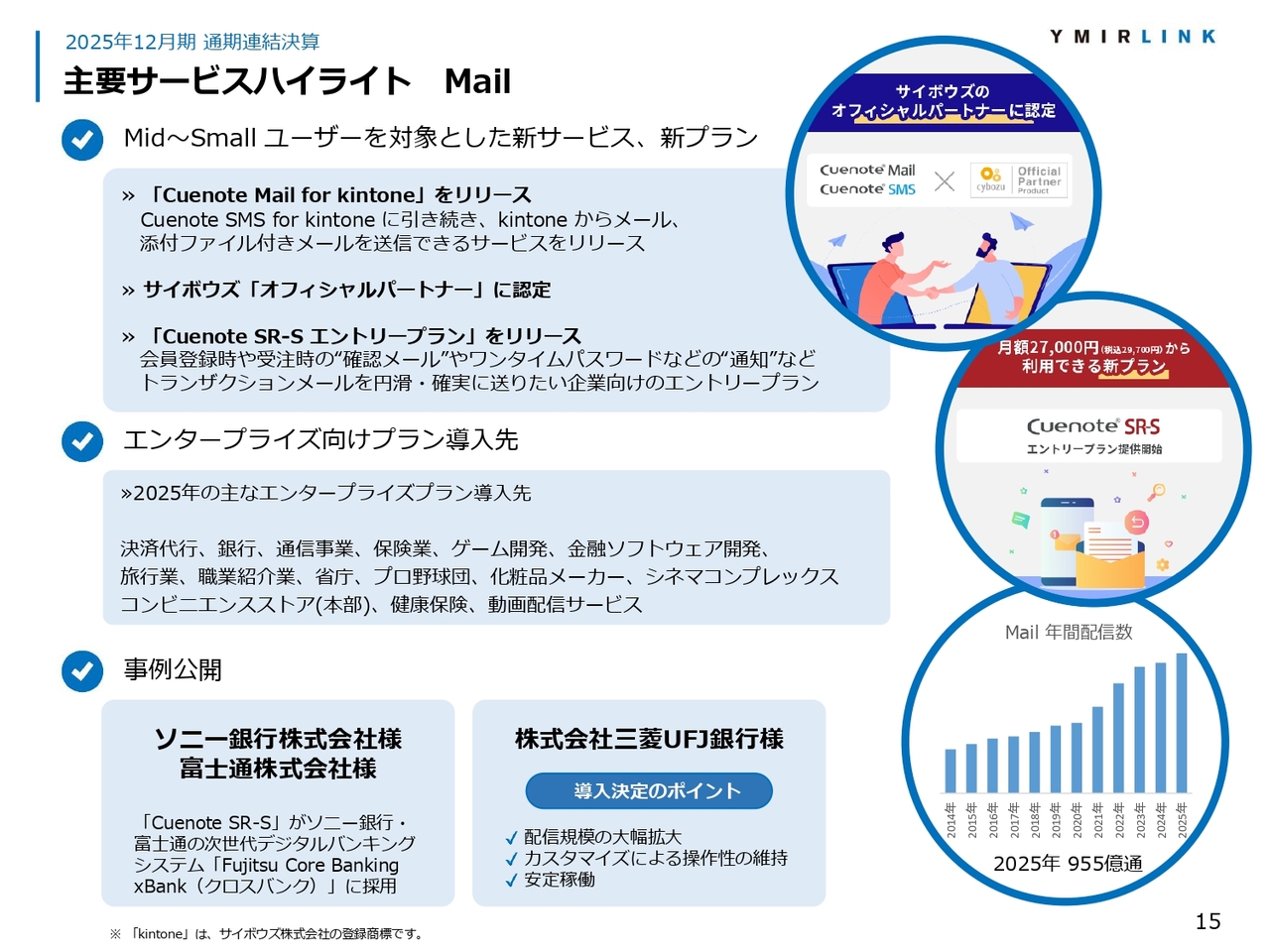 Mail配信数も増加しており、2025年は年間955億通の配信実績を記録しました。こちらも過去最高の配信数となっています。