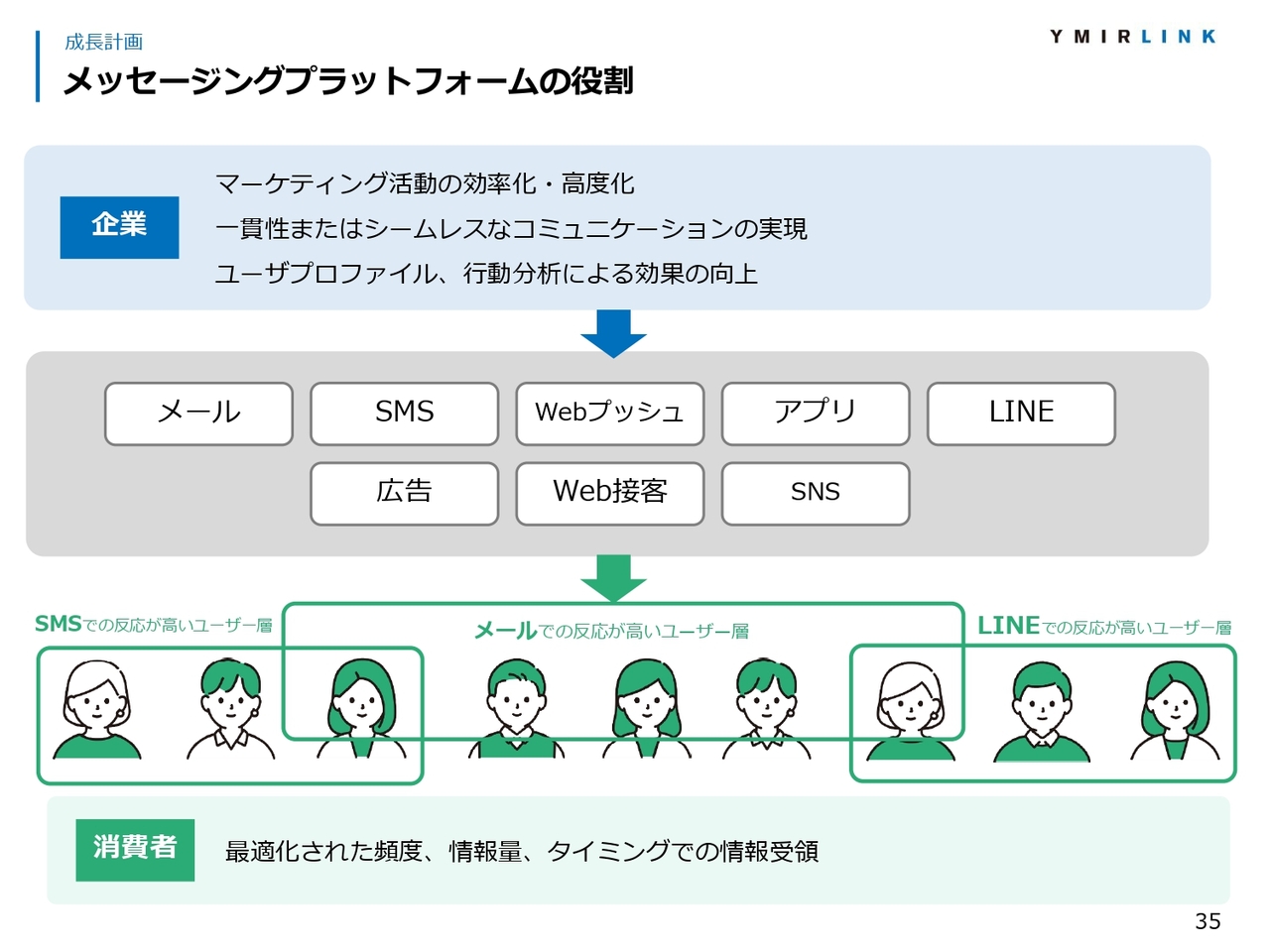 成長計画です。キーワードは「メッセージングチャネルの拡充とプラットフォーム化により持続的な成長を遂げる」としています。このキーワードは当社の目指す方向性を示しています。