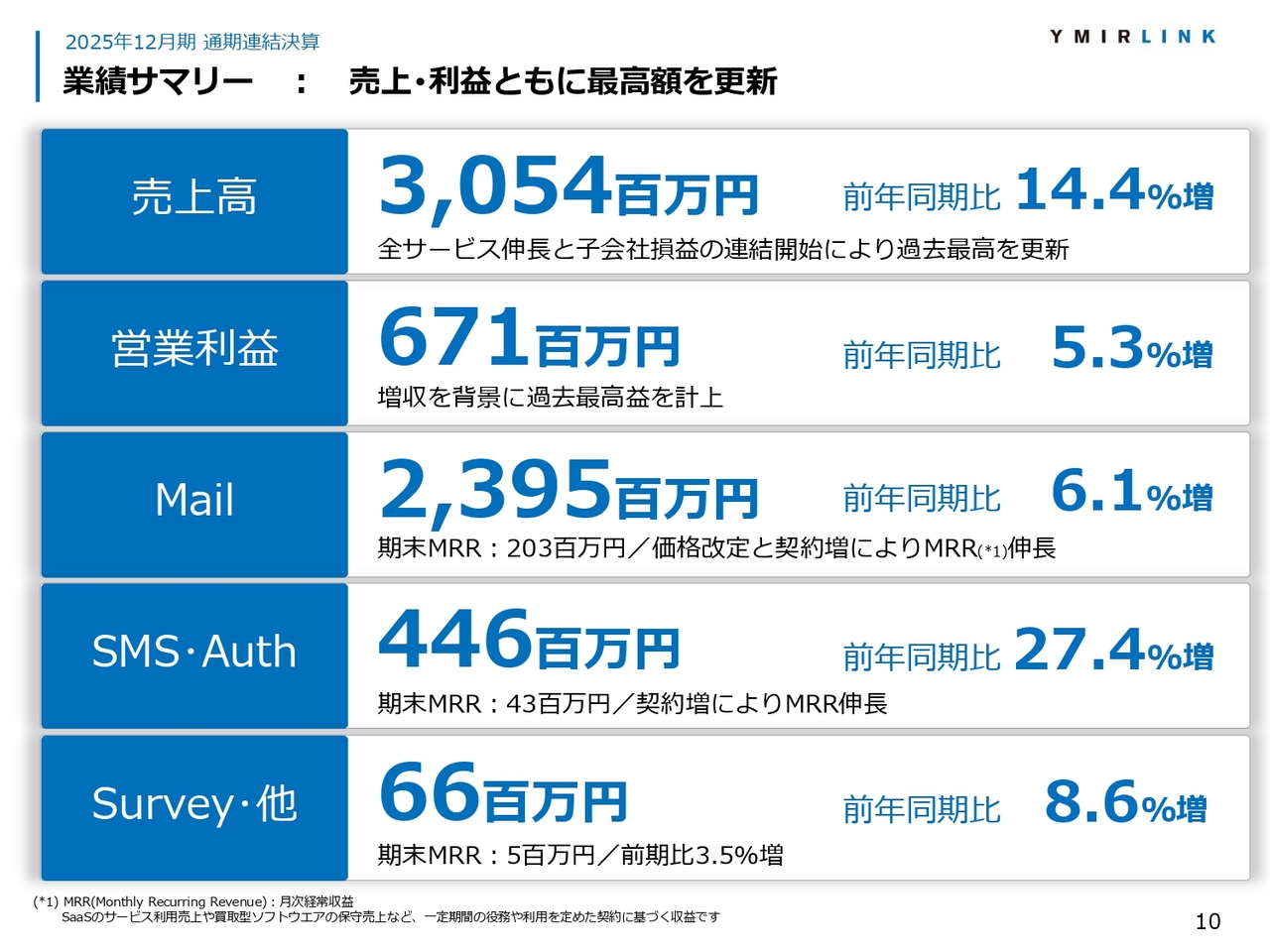 SMSサービスの売上高は前年同期比27.4パーセント増収の4億4,600万円、期末MRRは4,300万円となりました。「Survey」やその他サービスの売上高は、前年同期比8.6パーセント増収の6,600万円となりました。