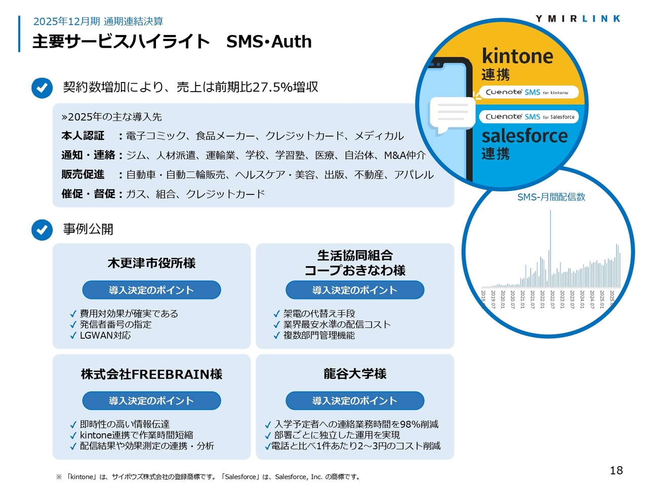 SMSサービスのハイライトです。新規利用者の増加に伴い、前年同期比で27.5パーセントの増収となりました。