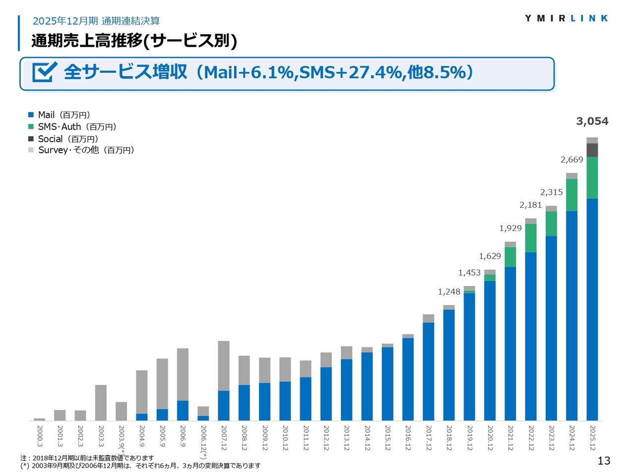 サービス別の売上高推移です。すべてのサービスにおいて前年同期比で増収となりました。Mailサービスは2003年のサービス開始以降、連続して増収を達成しています。
