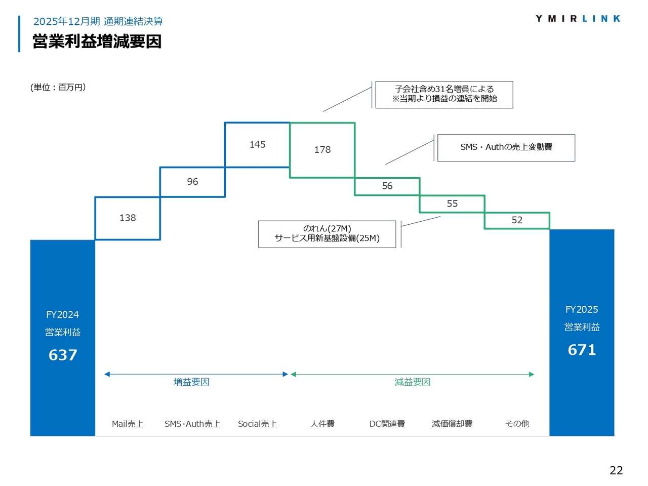 一方、減益要因としては、連結増員に伴う人件費の増加で1億7,800万円、SMSサービスでの売上の増加に伴う売上変動費の増加で5,600万円、設備投資とのれんに関連する減価償却費の増加で5,500万円、その他費用の5,200万円の増加が挙げられます。