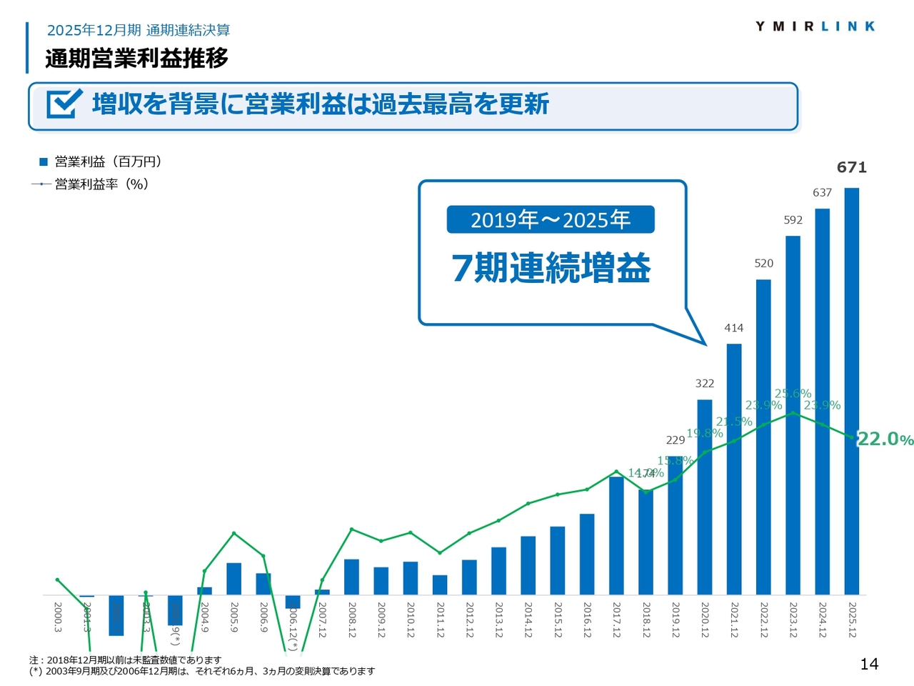 通期営業利益推移です。増収を背景に、営業利益も過去最高額を計上しました。営業利益は7期連続で増益となっています。