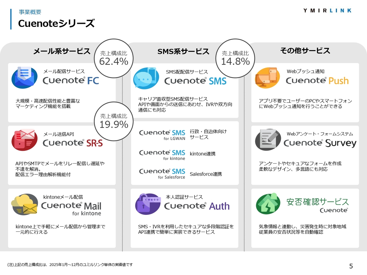 現在の「Cuenote」シリーズの主な製品です。メール系サービスは3種類、SMS系サービスは2種類、その他サービスとしてWebプッシュ通知サービス、Webアンケート・フォームシステム、安否確認サービスなども展開しています。