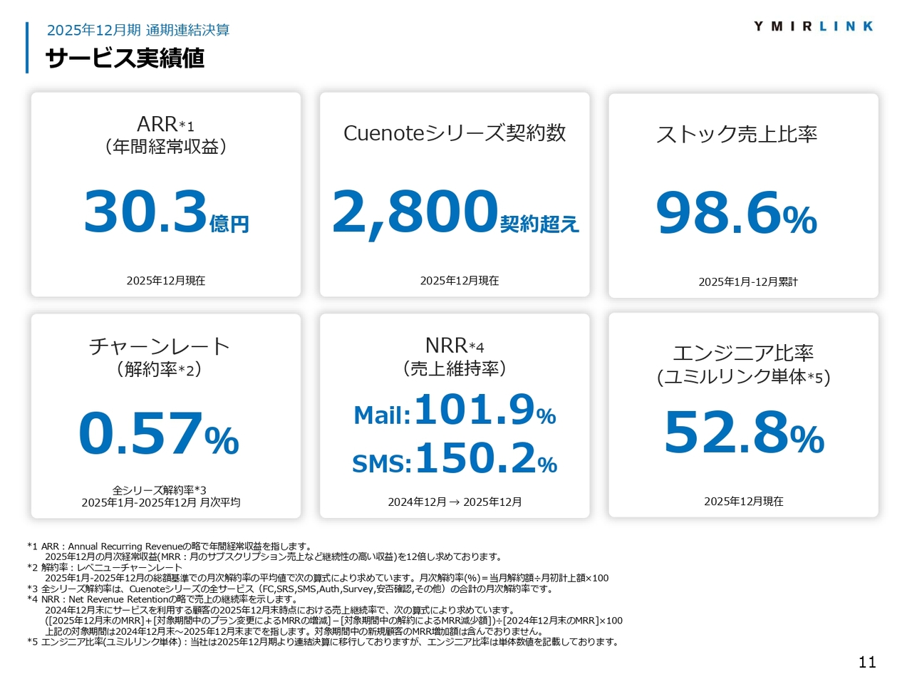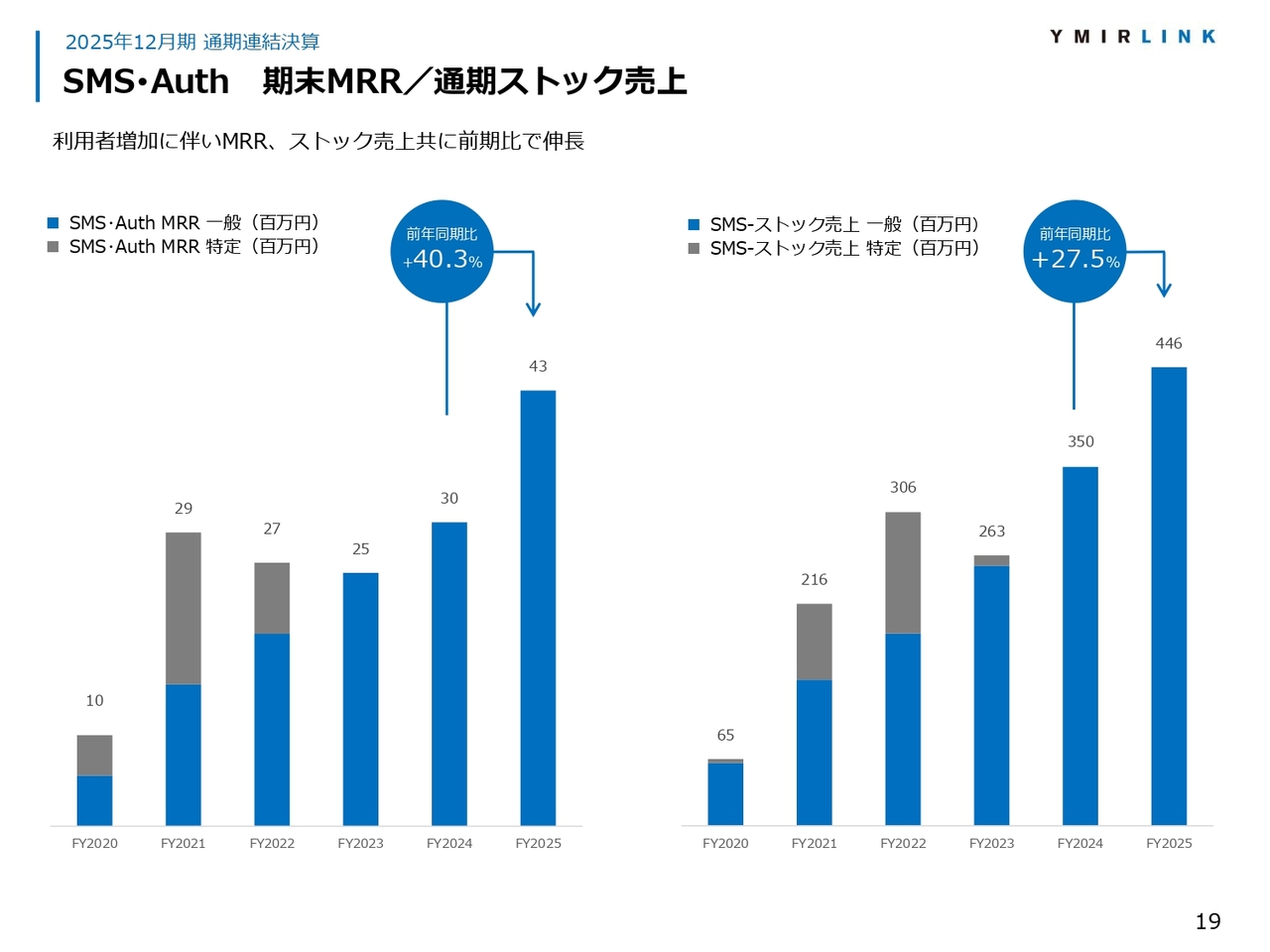 SMSサービスのストック売上指標です。期末MRRは前年同期比で40.3パーセント増加し、4,300万円となりました。通期ストック売上は前年同期比27.5パーセント増加の4億4,600万円となっています。
