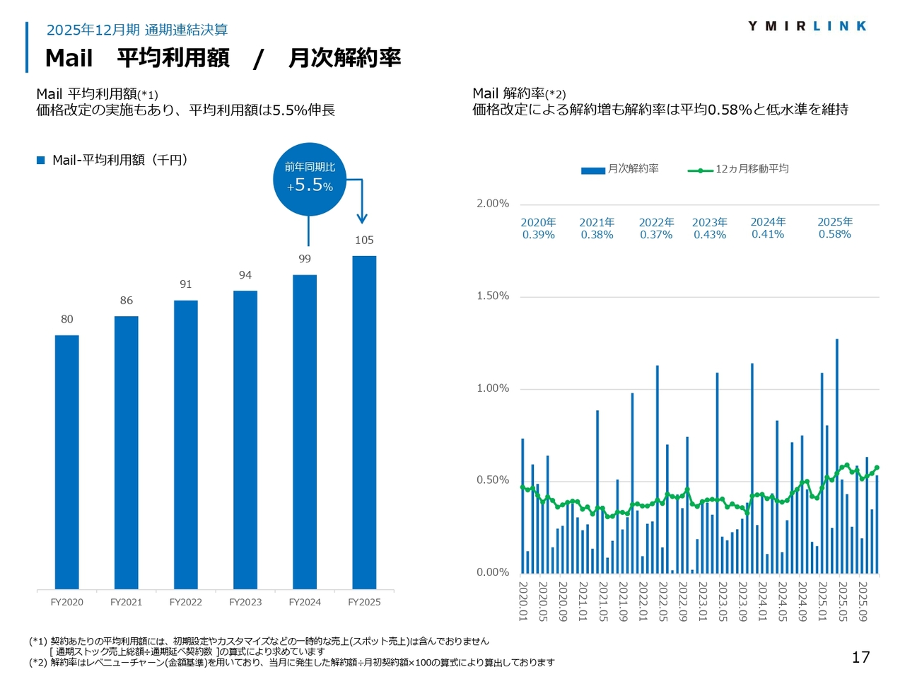 Mailサービスの平均利用額と月次解約率です。平均利用額は前年同期比で5.5パーセント増加し、10万5,000円となりました。