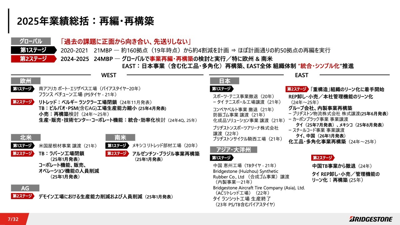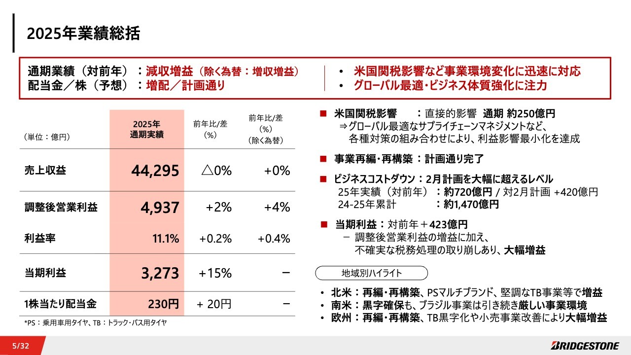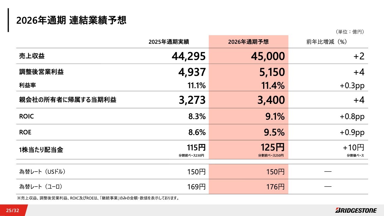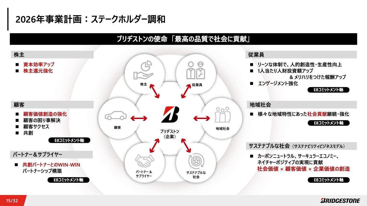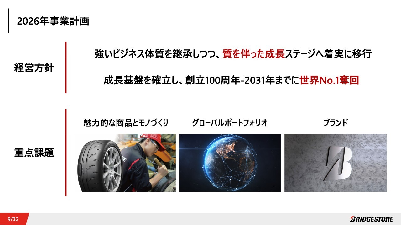 森田泰博氏(以下、森田):株式会社ブリヂストン代表執行役Global CEOの森田です。本日はお忙しい中、ご参集いただき、誠にありがとうございます。まず、私から2025年の通期業績および2026年の事業計画について総括します。