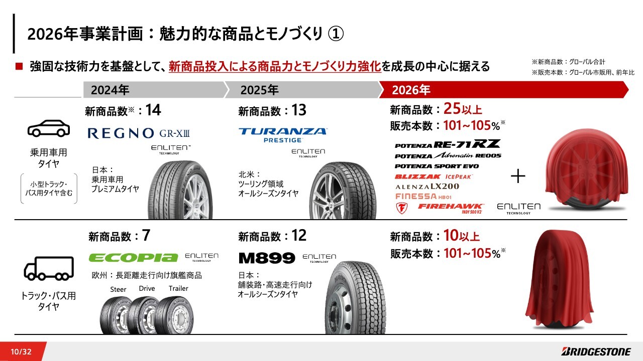 強固な技術力を基盤として、新商品の継続投入による商品力とモノづくり力の強化を軸に、チャネル強化なども連動させて成長を実現していきます。2026年には乗用車用タイヤで、過去数年平均の約2倍にあたる25商品以上の新商品をグローバルで投入し、販売を拡大する計画です。