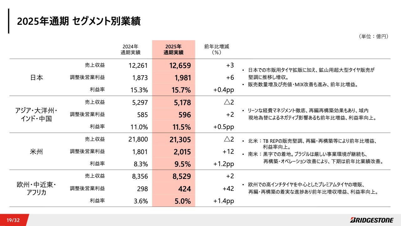 主要エリア別の総括です。まず北米については、需要状況が緩やかだったこともあり売上は前年から3パーセント減少しましたが、調整後の営業利益率は11パーセントとなり、前年から1.5ポイント改善して増益となりました。トラック・バス用タイヤの生産拠点や固定費の最適化など、再編・再構築効果の創出に加え、PSマルチブランド戦略、TBタイヤ・ソリューション事業が堅調に推移しています。