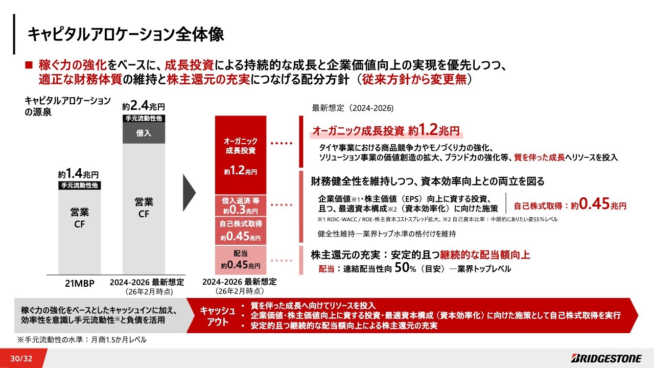 アロケーションについては、成長投資による持続的な成長と企業価値向上の実現を優先しつつ、適正な財務体質の維持と株主還元の充実につなげる従来のキャピタルアロケーション方針に変更はありません。