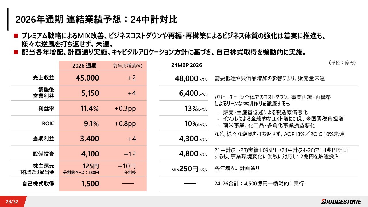 株主還元については、1株当たり配当金250円レベルのターゲットに対し、計画どおりの実施を見込んでいます。また、事業環境の変化に対応し、設備投資計画を見直したことを踏まえ、中期的にありたいバランスシートの実現に向けて、自己株式取得を機動的に実行します。2026年は1,500億円、2024年からの3年間の合計では4,500億円を実施することを決定しています。