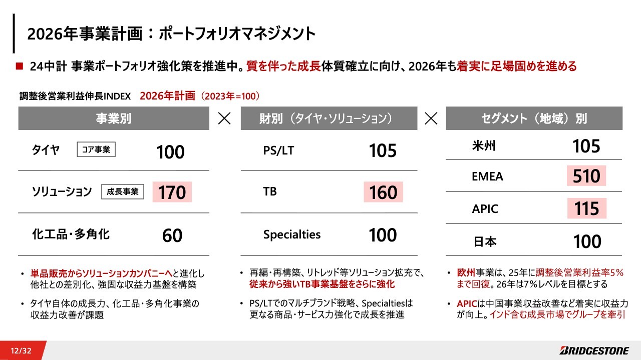 ポートフォリオマネジメントについてです。24中期経営計画で設定した方向に沿って、事業、財、セグメントごとにポートフォリオ強化による収益基盤の改善を進めています。2026年事業計画においても、その方向性を堅持する方針です。