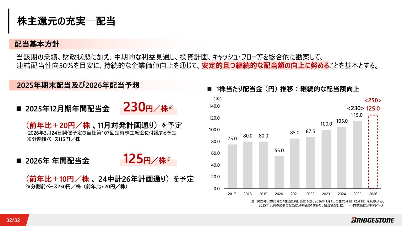 2025年の年間配当金は、昨年11月に発表したとおり、1株当たり230円で、対前年20円の増配となります。また、2026年については、1株当たり分割後ベースで125円、対前年10円の増配、分割前ベースでは250円、対前年20円の増配と、24中期経営計画の2026年計画どおりの配当を予定しています。