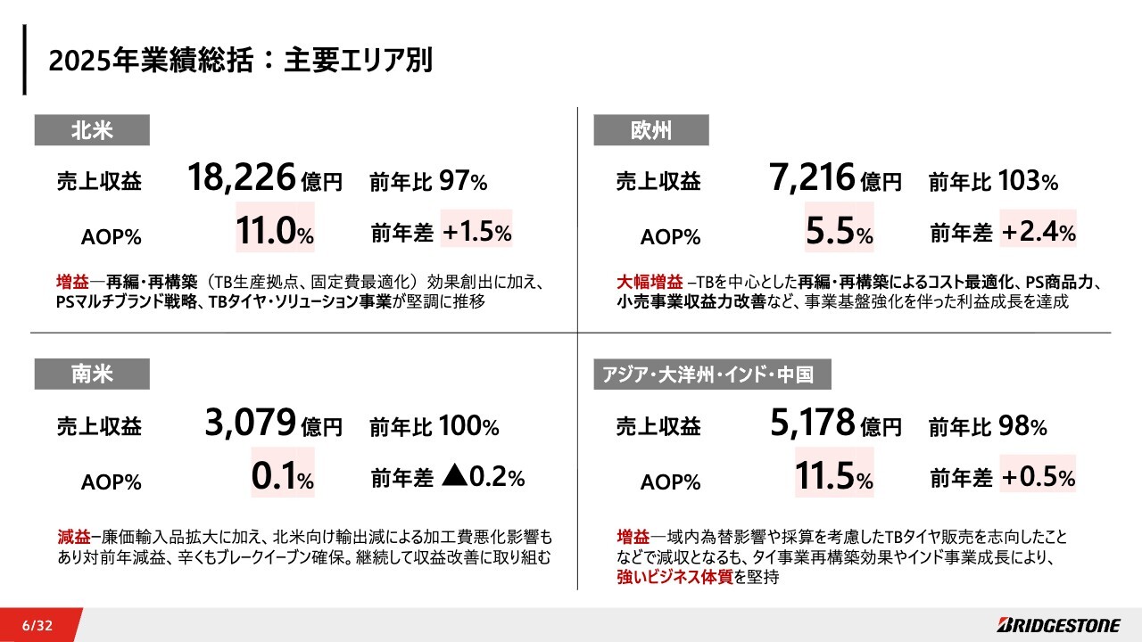米州についてです。北米では、市販用トラック・バス用タイヤの販売拡大や再編・再構築による体質改善等を通じて、前年比で増益となり、利益率が改善しています。一方、南米では全体として黒字で着地しましたが、ブラジルでは再構築やオペレーション改善により下期の業績は前年比で改善したものの、厳しい事業環境が続いています。