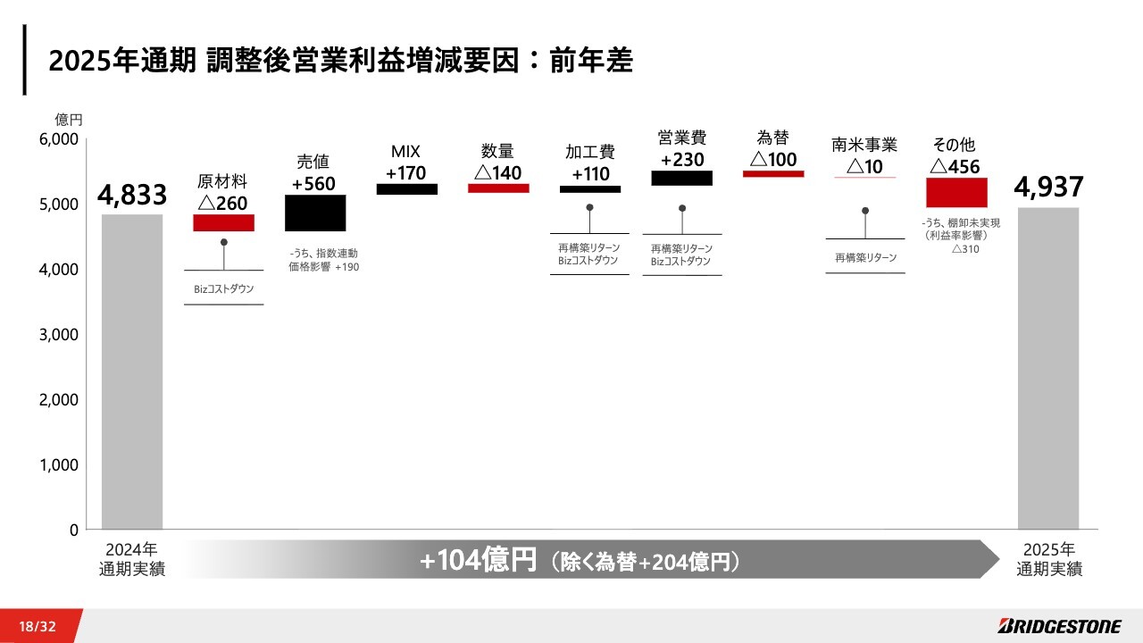 調整後営業利益の対前年増減要因です。原材料高や棚卸未実現などの減益要因を売値やMIXの改善で打ち返し、米国関税の影響についてはさまざまな対策によっておおむね相殺しました。また、事業再編・再構築やグローバルビジネスにおけるコストダウン活動を通じ、ビジネス体質を強化しました。その結果、為替の円高という向かい風がある中でも前年比増益で着地しました。
