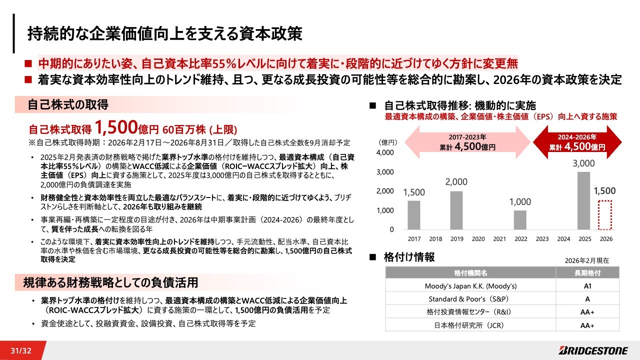 当社は、ROICとWACCのスプレッド拡大、バランスシートマネジメントを通じたエクイティスプレッドの拡大が企業価値向上に資すると考え、健全性と効率性を両立した資本構成に改善していく方針です。この方針に基づき、当社では「ブリヂストンらしさ」を軸として最適資本構成を検討し、中期的にありたい自己資本比率を55パーセントと設定し、着実かつ段階的にそれに近づけていく方針に変わりはありません。