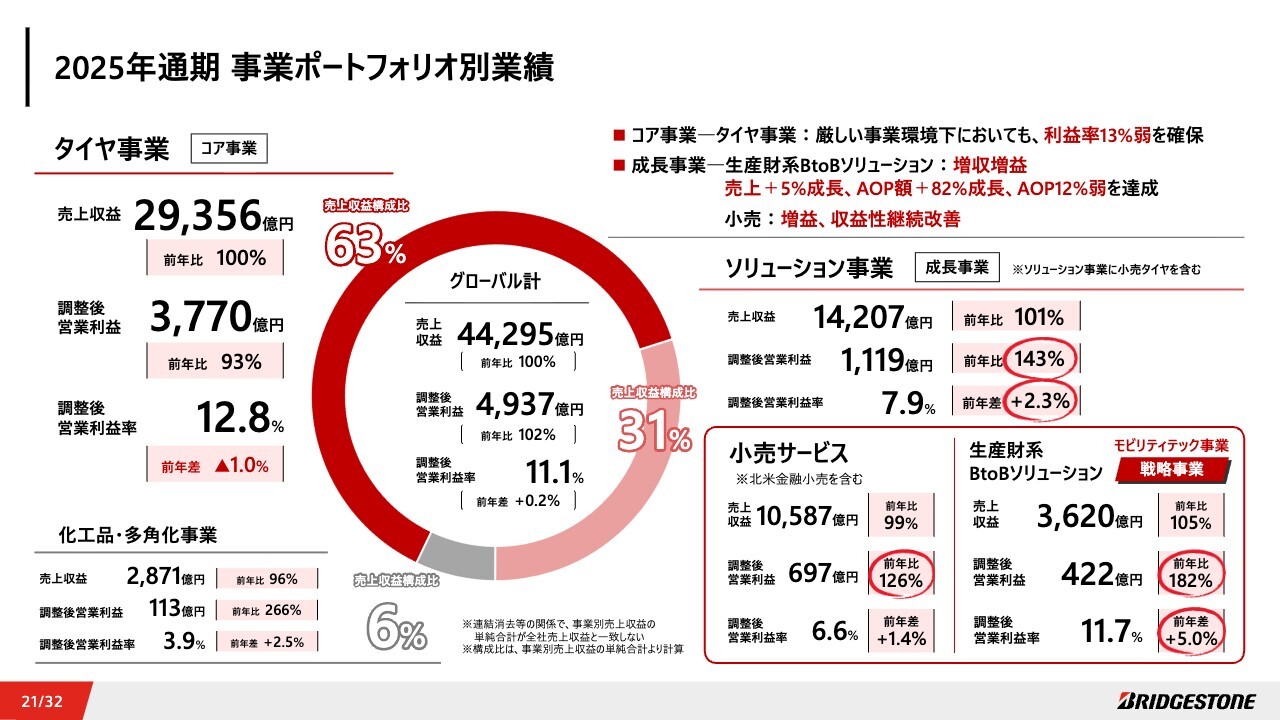 事業ポートフォリオ別業績です。タイヤ事業は、厳しい状況下においても、調整後営業利益率13パーセント弱を確保しました。成長事業であるソリューション事業は増収増益で、収益性も改善しています。特に、生産財系BtoBソリューションは利益率11パーセント超を達成しました。