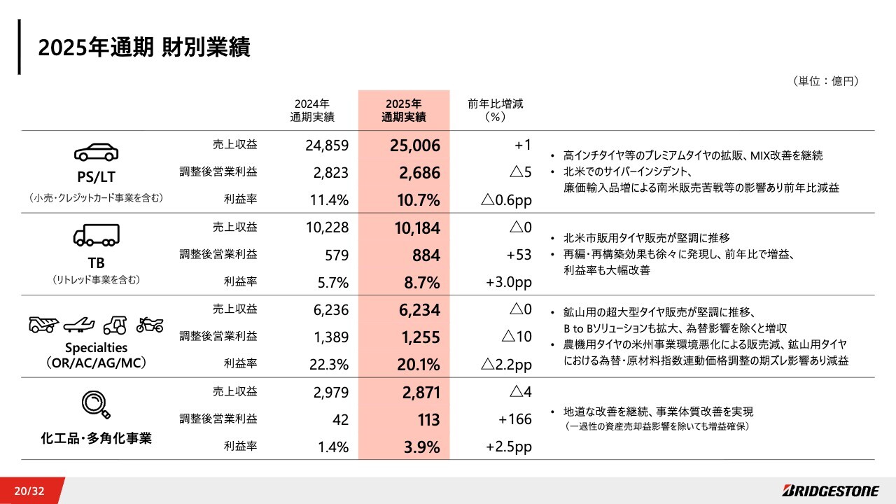 Specialtiesでは、鉱山用超大型タイヤの販売が堅調に推移し、BtoBソリューションも拡大しました。一方で、農機用タイヤの販売減や、鉱山用タイヤにおける為替・原材料指数連動価格調整の期ズレ影響などにより減益となりました。それでもなお、20パーセントを超える高い収益率を確保しており、連結全体の業績を下支えしています。