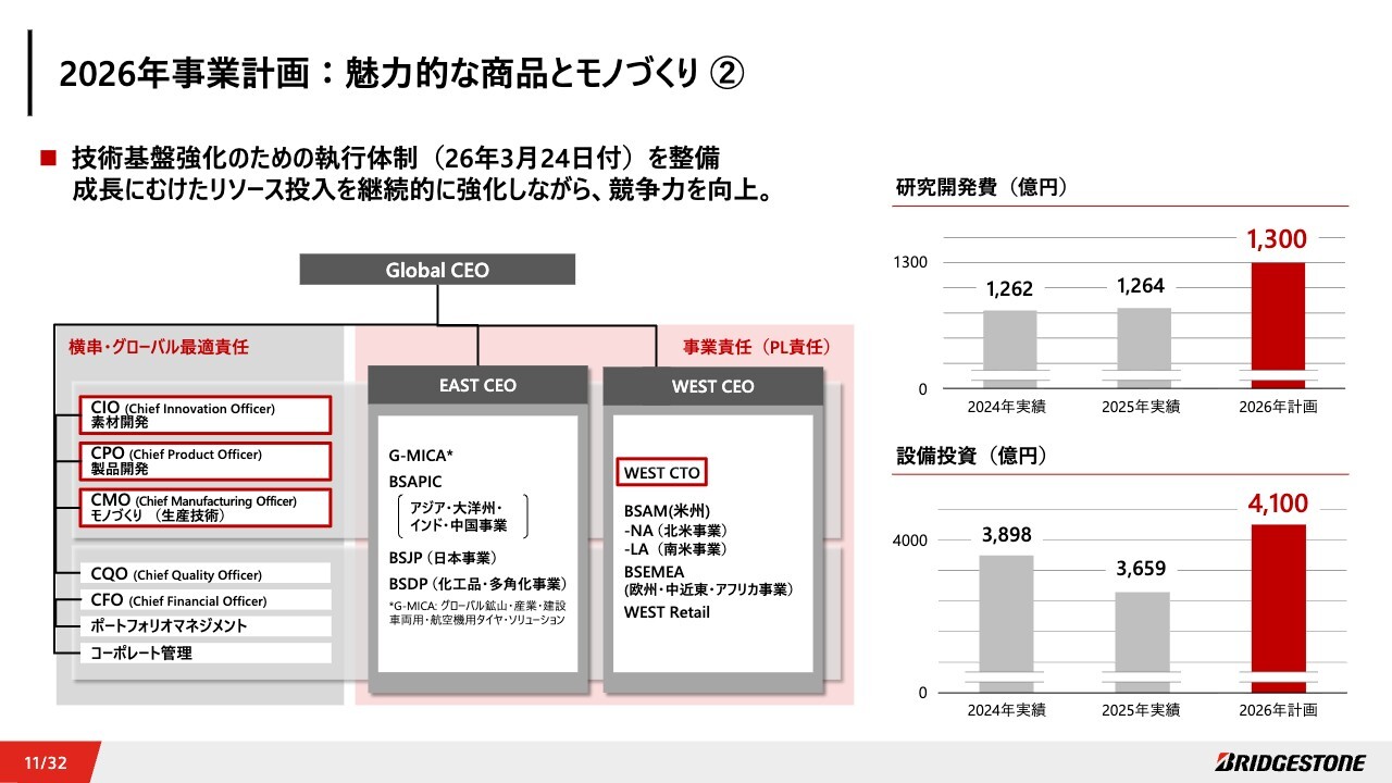 事業責任については、これまでと同様にEAST CEOとWEST CEOの2執行役体制を堅持し、私を含む計7名の執行役が一丸となってブリヂストングループを率いていきます。リソースに関しても、研究開発費、設備投資ともに過去2年を上回る水準に設定し、規律を持った上でリソース投入の拡大を計画しています。