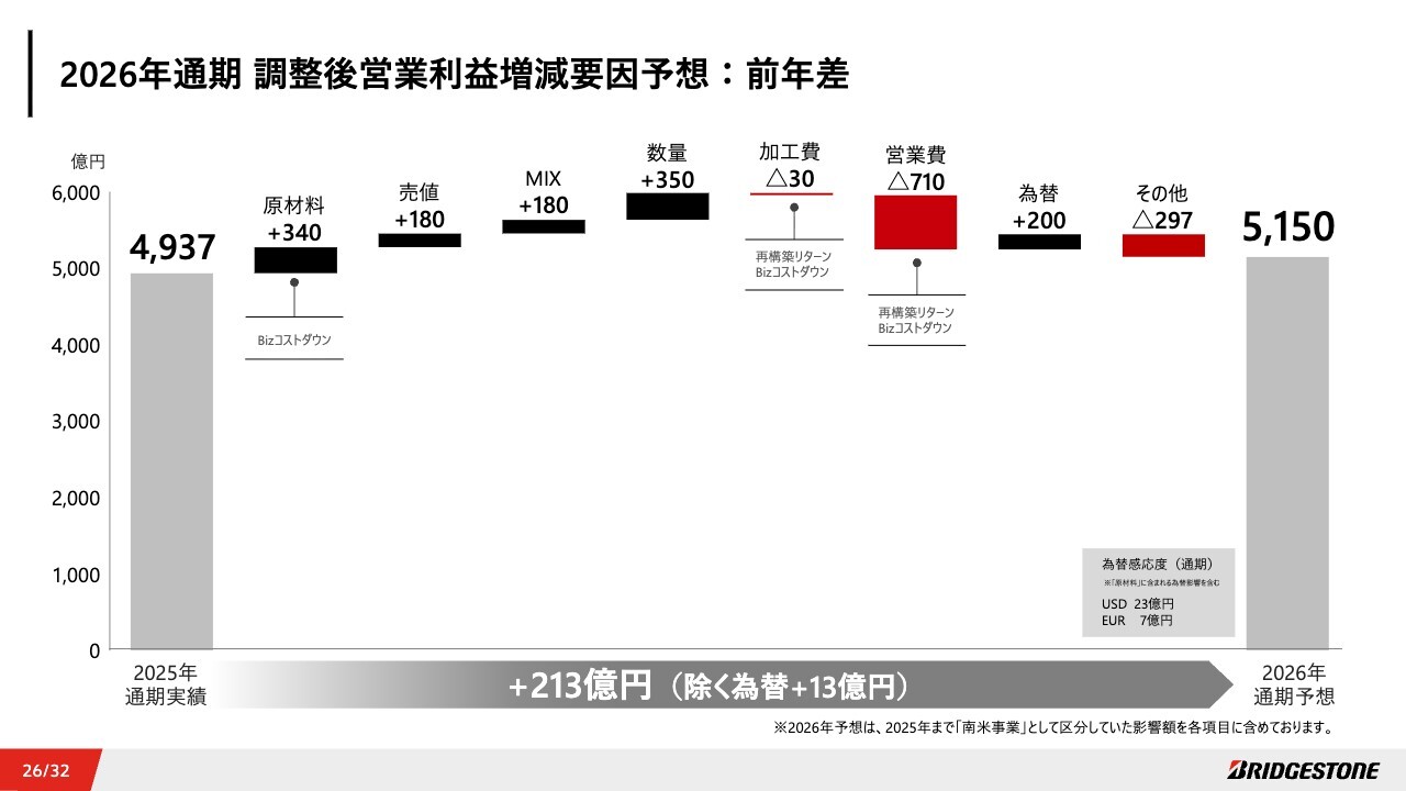 菱沼:増減要因における原材料部分の動きについては、2025年は、主に天然ゴムの相場が前年に比べて高かった影響で、天然ゴムが全体として業績のマイナス要因となっていました。しかし、2026年は相場が落ち着いてきており、プラス方向に寄与していることが、2025年から2026年の主な動きの要因となっています。