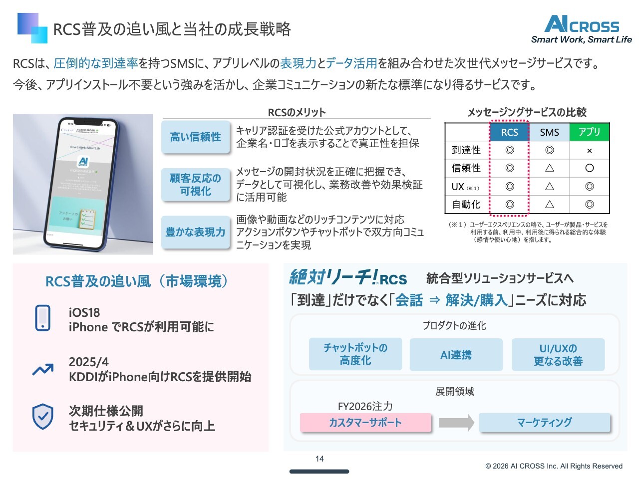 この部分については、先ほどお話ししたように市場が拡大していますので、RCSへの拡大によって収益をさらに伸ばしていきます。また、RCSの導入により利用用途が広がり、SMSでは限定されていた用途から特にマーケティング分野での活用を拡大していきます。